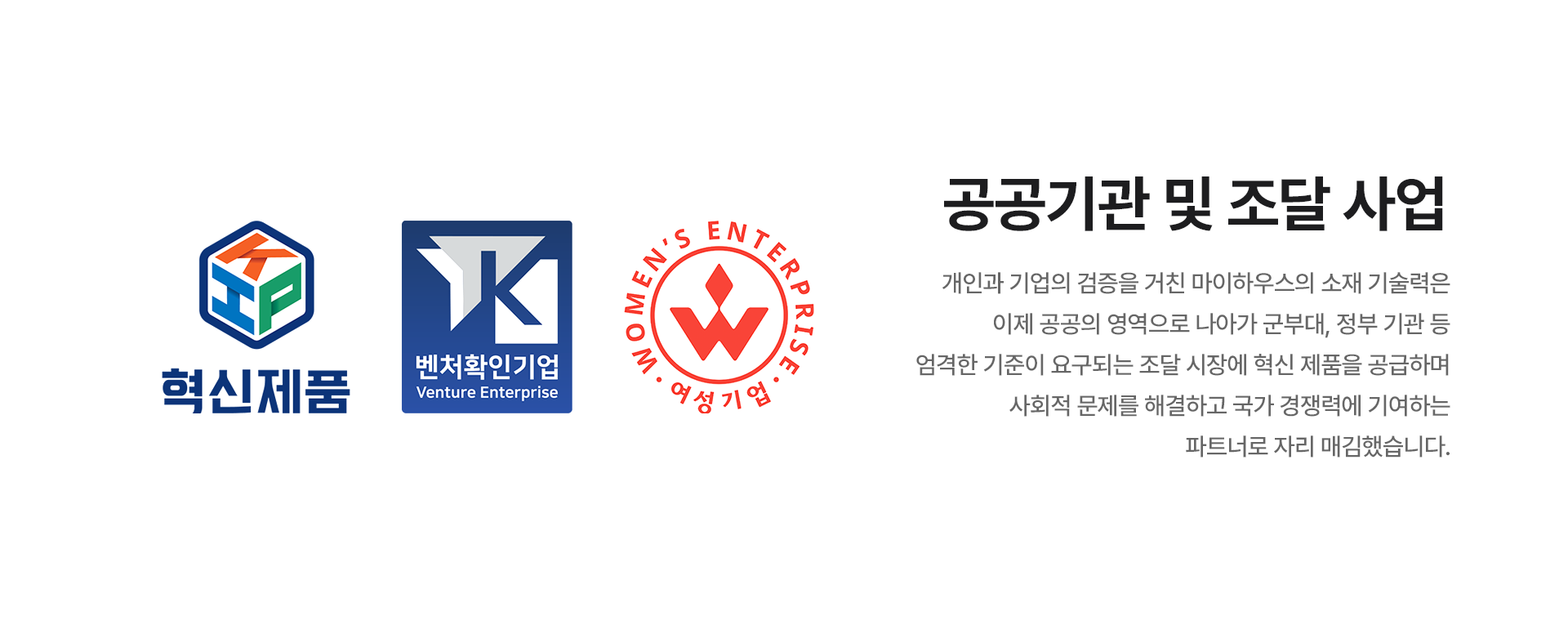 공공기관·조달사회적 문제 해결을 위해 마이하우스는정부와 협력하여 자체 개발 한 혁신 소재를 공급